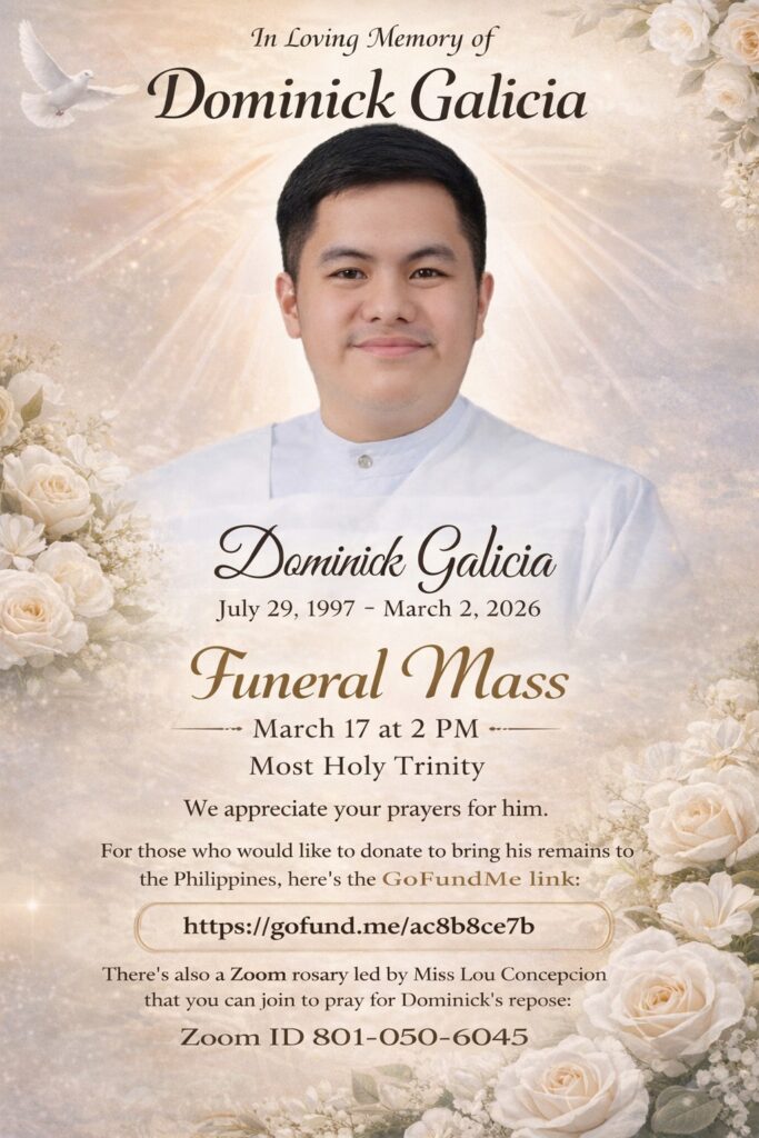 Funeral Mass: March 17 at 2:00pm (5:00 AM Philippine Time) Livestreamed at Most Holy Trinity Parish