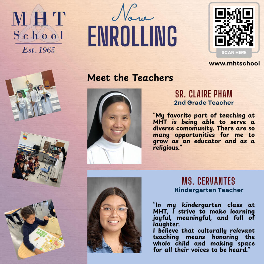 Financial aid is available to help make Catholic education accessible for all families. Ways to contact: Scan QR Code below, visit our website ww.mht.school or call our office 408-729-3431 for more information and to schedule a tour.