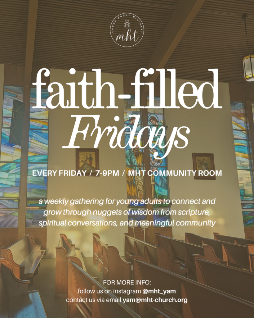 She will be collaborating with Father Marty to create opportunities for……….. evangelization, prayer, spiritual formation, and leadership within the young adult community, serving both their peers and the wider MHT community.